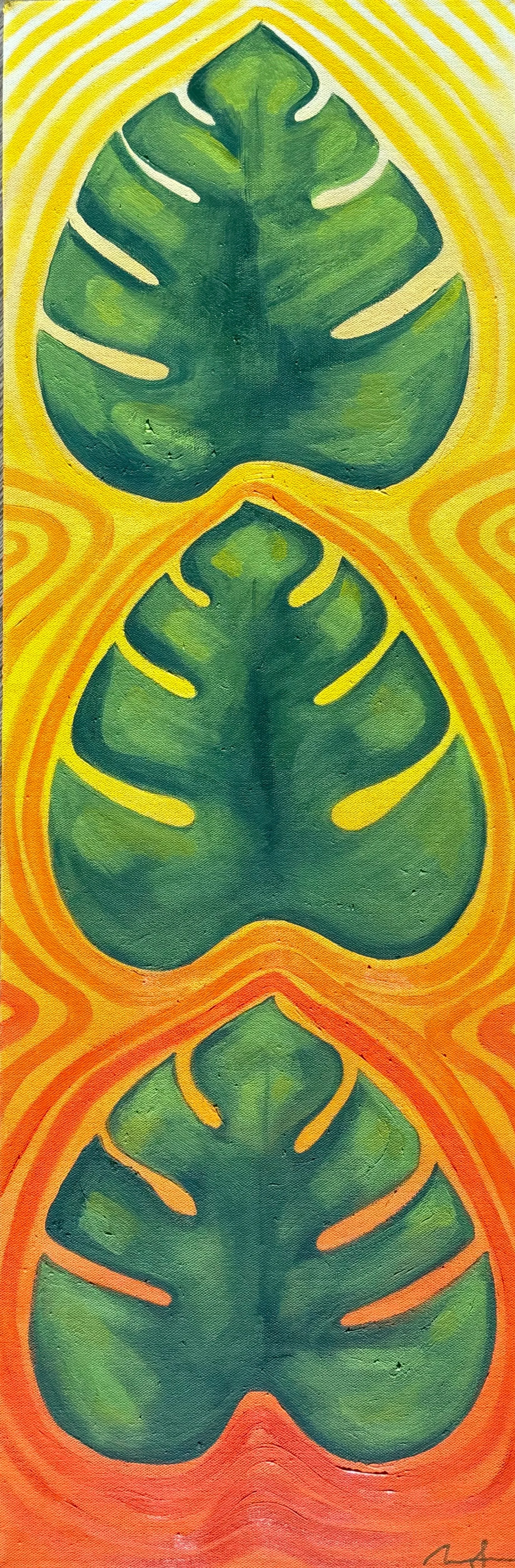 An oldie but a goodie, this piece was originally created in 2018 in my elective painting class. It started as three simple monstera leaves on a white background. In 2024, I took this piece and Revamped it to put some good vibrations in place of the plain white background.