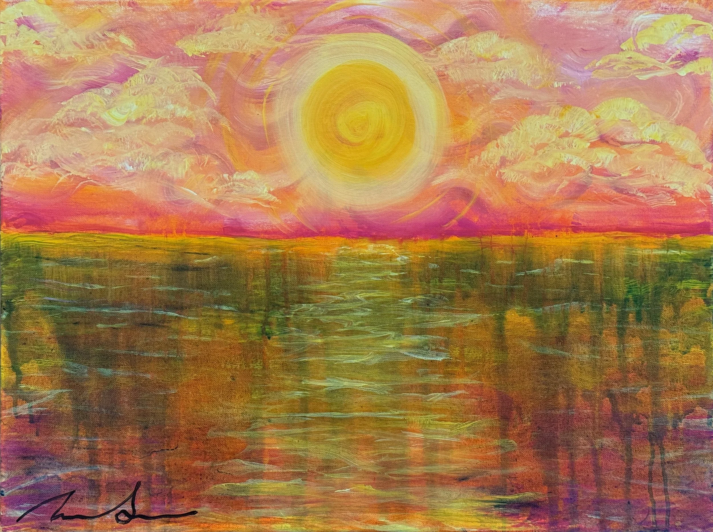 The first layers were an acrylic wash on the canvas which were layered, wet on wet, with a dark green wash to start the horizon line. The sunset sky was made with layers of swirls and various hues of yellow, orange, pink, and fushia. The sun, clouds, and water reflections were added last with the lightest color paint.