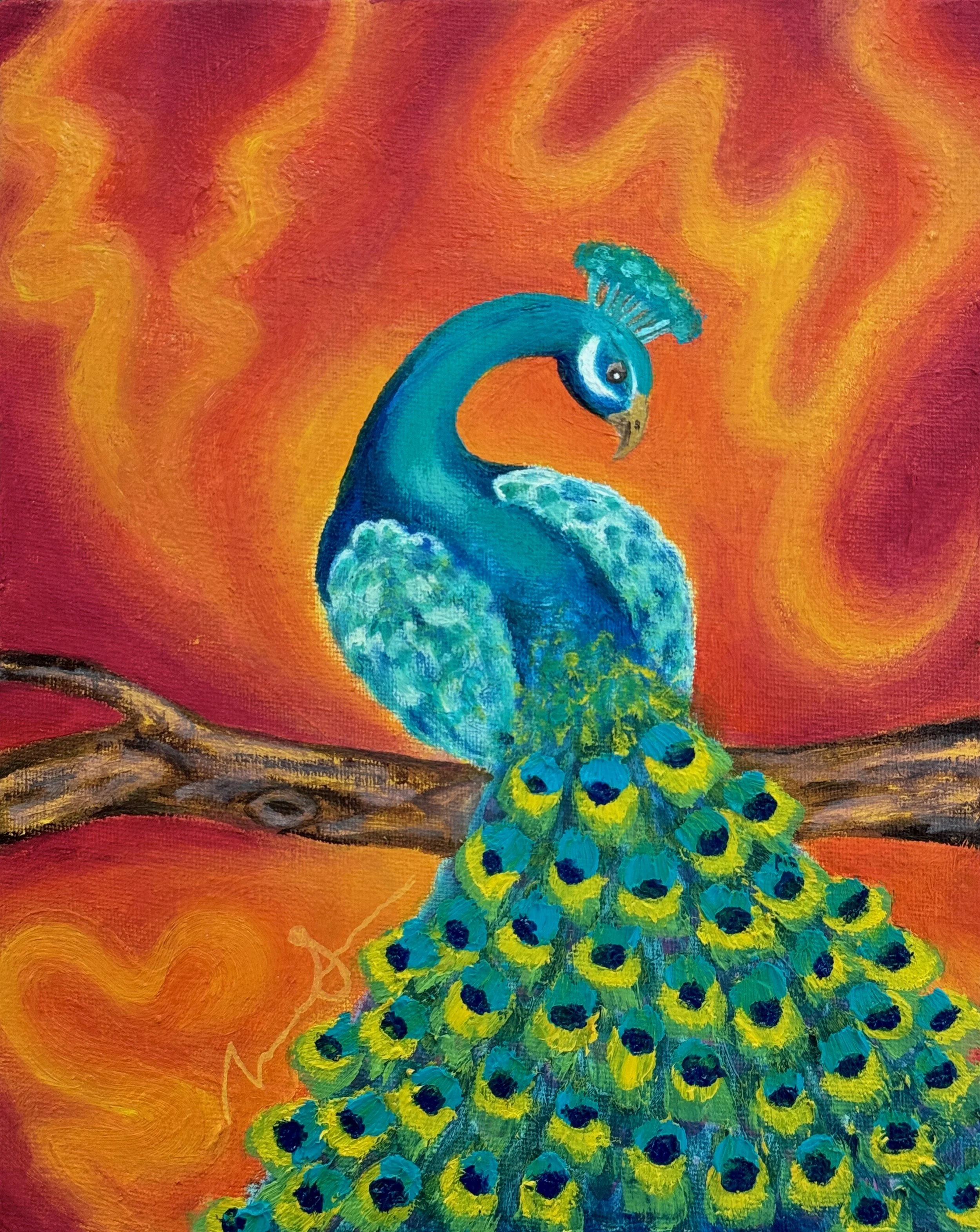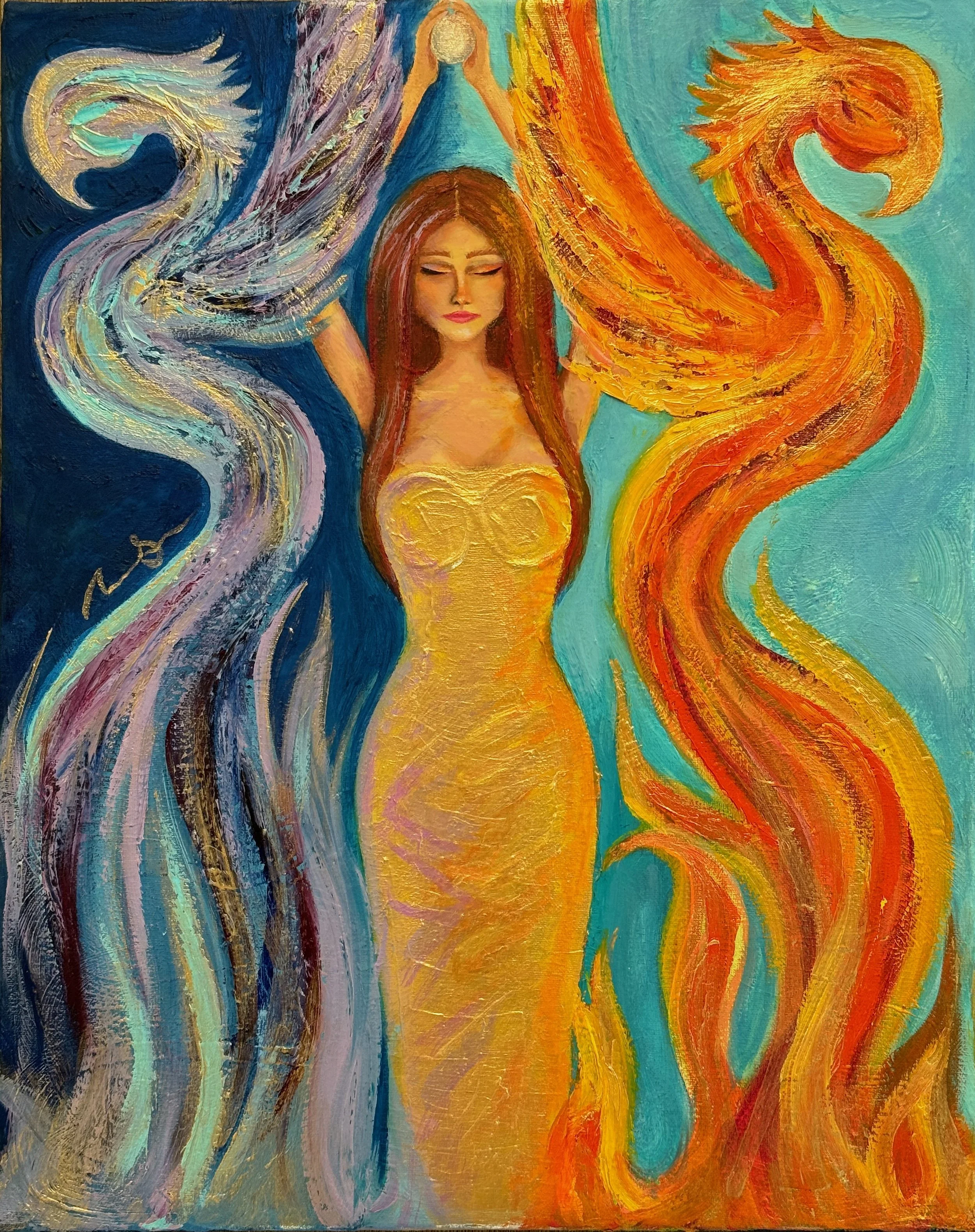 A woman stands strong in the red and blue flames of a wild fire. Her arms are outreached over her head to receive the pearl of wisdom. It is bestowed to her as a reward for her successful journey through the fire and flames. Two phoenixes rise beside her as so does her spirit.